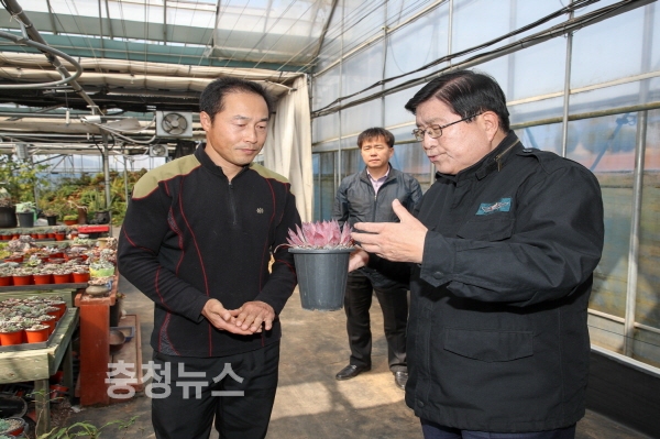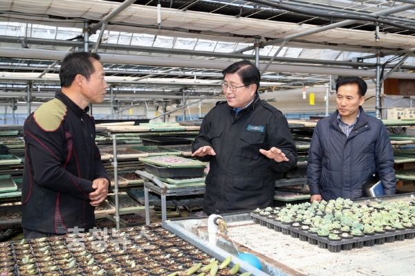 군에 따르면, 한 군수는 이날 태안읍의 딸기 고설식 벤치시설과 다육이 저면관수 베드시설을 찾아 친환경 농법을 활용한 지역 농산물 재배 현장을 점검했다.