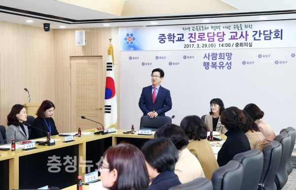 대전 유성구(구청장 허태정)는 자유학기제 지원 등 청소년 진로교육 내실화 및 교육공동체 협력체계 구축을 위해 관내 중학교 진로담당 교사 간담회를 29일 구청 중회의실에서 개최했다고 밝혔다.