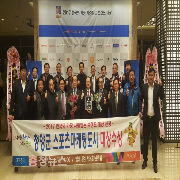충남 청양군은 31일 밀레니엄 서울힐튼 호텔에서 개최된 조선비즈(조선경제i) 주관 제7회 한국의 가장 사랑받은 브랜드 대상 시상식에서 스포츠마케팅 도시로 선정돼 수상의 영예를 안았다.