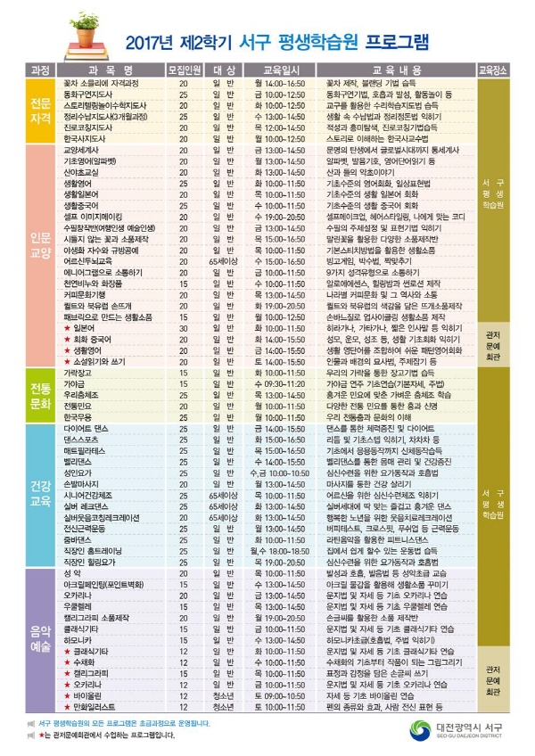 대전 서구(구청장 장종태)는 4일부터 11일까지 ‘2017년 2학기 평생학습원 수강생’을 모집한다고 밝혔다.