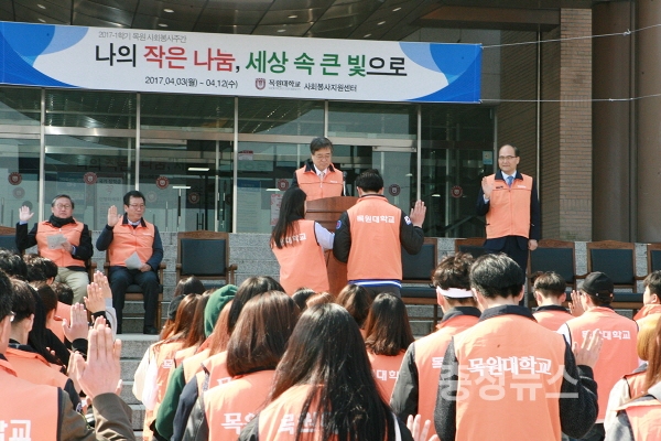 3일 목원대 도서관 앞 광장에서 열린 ‘목원사회봉사주간’ 출정식에서 학생대표가 선서하고 있다