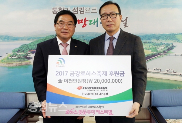 글로벌 선도 타이어 기업 한국타이어(대표이사 서승화)는 3일  대전 대덕구 오정동 대덕구청에서 박수범 대덕구청장, 이기영 한국타이어 대전공장장 등이 참석한 가운데 '제6회 금강로하스축제'의 성공적인 개최를 기원하는 후원금 2천만원을 전달했다.
