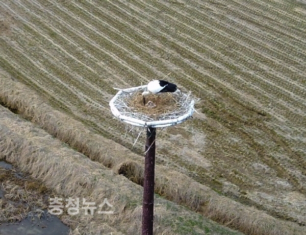 충남 예산군이 지난 3월 16일 한황이와 세황이 부부가 광시면 관음리 인공둥지 탑에서 부화에 성공한 데 이어 또 다른 황새 한 쌍의 새끼 황새가 태어나는 겹경사를 맞았다.