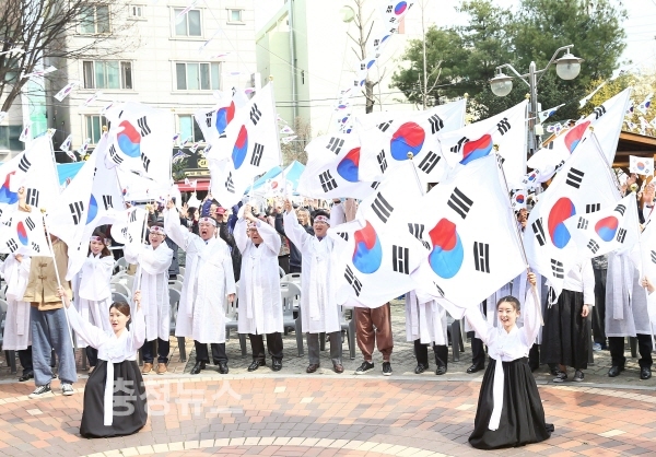 4일 오후 “대한민국만세” 소리가 대전 유성장터에 메아리로 울려 퍼졌다. 이날 지역 주민 등 500여명이 참여해 1919년 당시 독립만세 운동의 주역이었던 순국선열들의 애국정신을 이어받아 만세운동을 생생하게 재연했다.