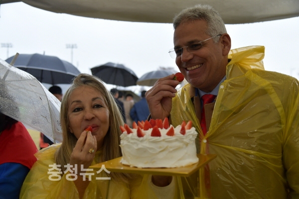 황명선 시장은 외교사절을 영접하고 함께 축제장을 찾아 딸기축제와 논산딸기의 우수성을 설명하며 빗속에도 논산딸기를 알리기 위한 열띤 행보를 이어갔다.