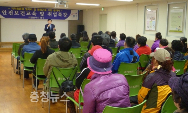 대전 중구(구청장 박용갑)는 6일 보건지소 교육장에서 지역공동체일자리 및 공공근로사업 참여자 50여 명이 참석한 가운데 안전보건교육을 실시했다.