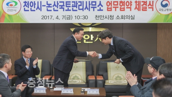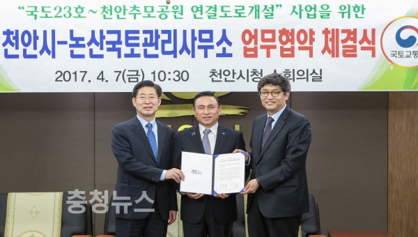 충남 천안시와 논산국토관리사무소(소장 김준범)는 7일 시청 소회의실에서 구본영 시장과 김준범 소장 등이 참석한 가운데 ‘국도23호~천안추모공원 연결도로개설사업’ 업무 협약을 체결했다.
