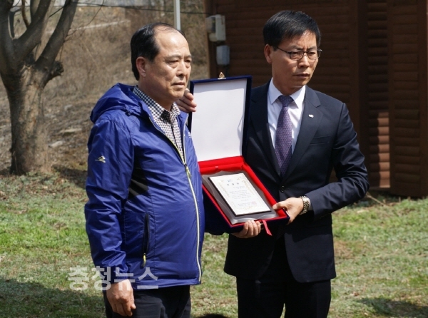 유상선 한국농어촌공사 청양지사장(우) 하천수 담수사업 공로자 감사패 수여(최상락 씨)