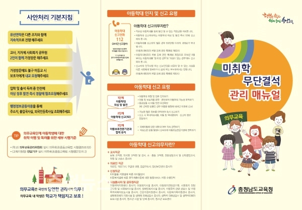 충남도교육청(교육감 김지철)은 미취학 및 무단결석 학생 관리에 대한 리플릿을 제작해 교육지원청 및 학교에 배포했다고 지난 6일 밝혔다.