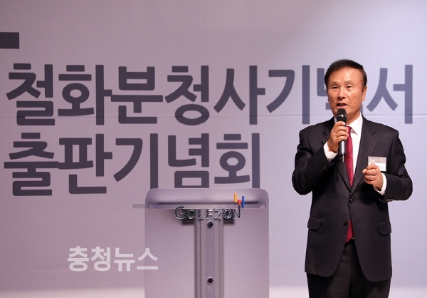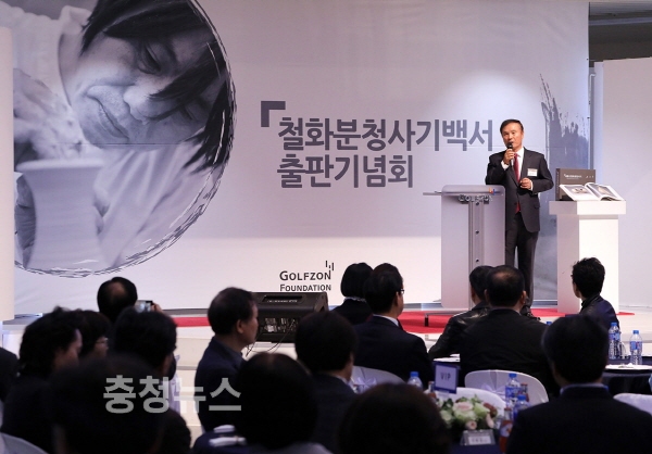 골프존문화재단 김영찬 이사장이 계룡산철화분청사기백서 발간을 기념해 환영사를 하고 있다.