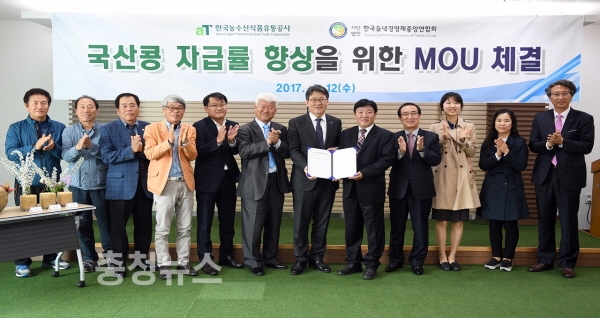 한국농수산식품유통공사(사장 여인홍), (사)한국들녘경영체중앙연합회(회장 김원석)는 12일 전남 나주시 aT 본사에서 ‘국산 콩의 식량자급률 제고를 위한 업무협약(MOU)’을 체결하였다.