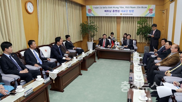 권선택 대전시장은 12일 시청을 방문한 응웬 반 퐁(Nguyễn Văn Phóng) 베트남 흥옌성 성장 등 방문단과 양도시간 국제교류 협력방안에 대한 의견을 교환하고, 오는 9월 대전에서 개최되는 ‘2017아시아태평양도시정상회의(APCS)’ 국제행사에 참석을 요청했다.