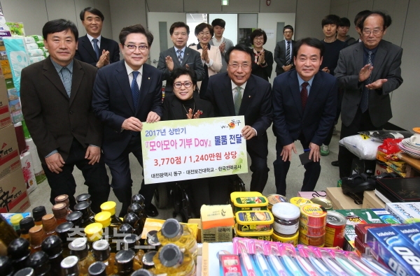 대전 동구는 13일 구청 생활지원국 사무실에서 한현택 구청장, 서중석 대전보건대학교 총장 등이 참석한 가운데 2017년 제1차 ‘모아모아 기부Day’ 물품 전달식을 가졌다.
