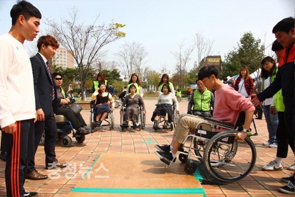 한밭장애인자립생활센터(소장 남인수)와 협력해서 진행된 캠페인에서 교직원들과 학생들은 직접 휠체어를 타고 간이턱과 경사로 등을 지나가보며 현실에서 장애인들이 겪는 어려움을 체험했다.