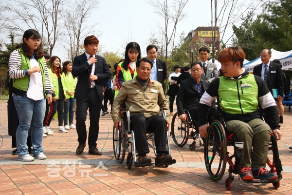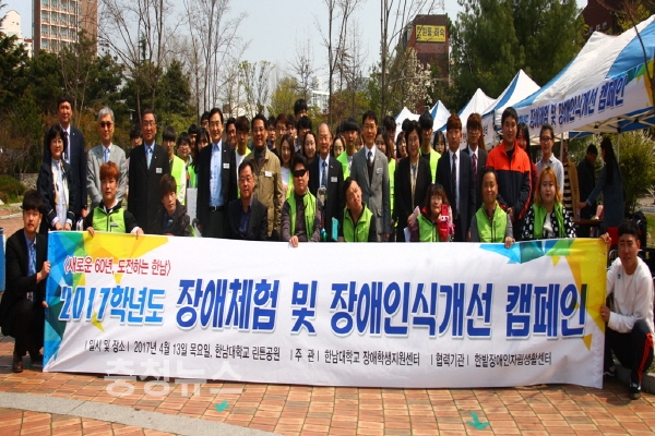 한남대는 장애인의 날(4월20일)을 일주일 앞두고 13일 교내 린튼공원에서 이덕훈 총장과 교직원, 재학생 등 100여 명이 직접 참여하는 ‘장애체험 및 장애인식개선 캠페인’을 실시했다.