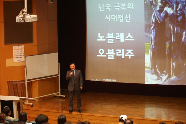 이날 오후 사범대학 심포지엄홀에서 열린 특강은 원아시아재단 후원의 ‘함께 사는 아시아공동체’ 릴레이강좌의 한 순서로 한남대 학생과 교직원, 일반 시민 등 160여 명이 참석했다.