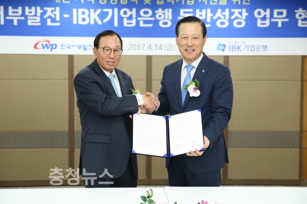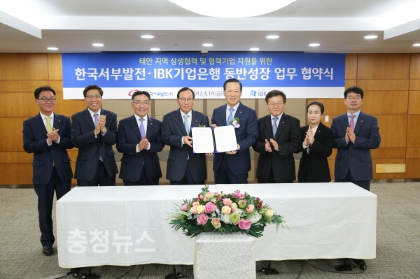 한국서부발전(사장 정하황)은 14일 IBK기업은행(은행장 김도진)과 기업은행 본사에서 ‘태안지역 상생협력 및 협력기업 지원을 위한 동반성장 업무협약’을 맺었다고 밝혔다.