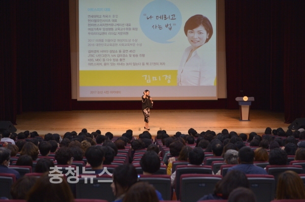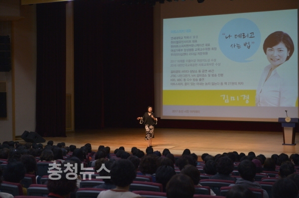 충남 논산시(시장 황명선)는 지난 14일 문화예술회관에서 스타강사 김미경 아트스피치 대표를 초청,‘나 데리고 사는 법’이라는 주제로 2017년 논산시민아카데미 두번째 강의를 개최했다.