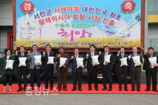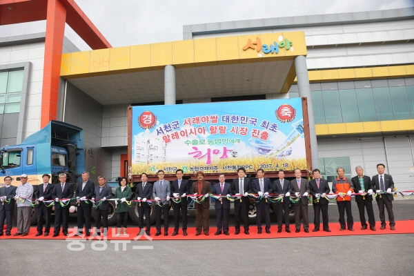 충남 서천군(군수 노박래)은 18일 화양면 서천군농협쌀조합 공동사업법인에서 말레이시아 총리실 다토가니 수석비서와 노박래 서천군수, 이정삼 농식품부 수출진흥과장, 신현관 농협경제지주 경제기획본부장, 동서천농협 오영환 조합장 및 농협 관계자가 참석한 가운데 말레이시아 쌀 수출 출정식 행사를 가졌다.
