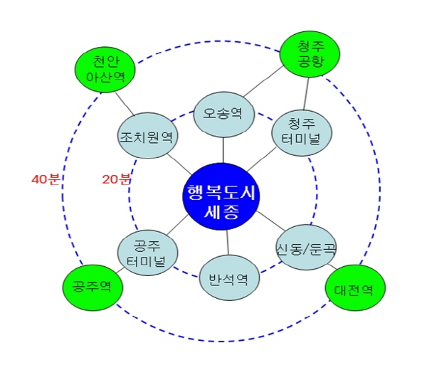 행복도시를 중심으로 20km 반경 내외에 위치한 6대 도시 거점(오송역, 청주터미널, 과학벨트 거점 지역인 신동둔곡지구, 반석역, 공주터미널, 조치원역)을 광역BRT로 20분대에 연결한다.