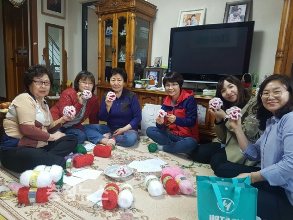 장항읍행정복지센터(읍장 최창근)는 어버이날을 맞이하여 새마을부녀회와 장항읍지역사회보장협의체가 한뜻으로 독거노인 어르신들께 전달하기 위하여 손뜨개 카네이션을 한 땀 한 땀 손으로 직접 만들고 있다.