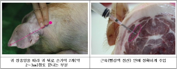 최성혁 축수산과 가축방역팀장은 “접종방법은 항체 양성률에 중요한 영향을 미치는 요인이다.”며 “백신이 적정 용량으로 주입될 수 있도록 3~5초 정도 시간을 두고 천천히 주사해줄 것과 동일한 주사바늘로 여러 마리를 접종 시 바늘이 오염될 수 있으므로 1침 1두(돼지는 1침 5두)의 원칙을 준수해 줄 것”을 농가에 당부했다.