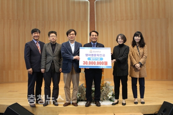 한남대 영어영문학전공 교수 6명은 19일 정성균선교관에서 각 5백만원씩 총 3천만 원의 장학기금을 이덕훈 총장에게 전달했다.