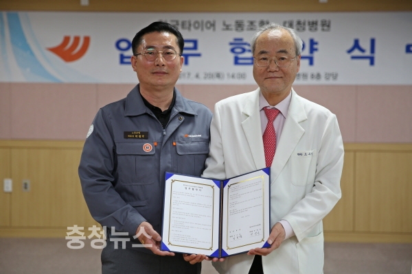 대청병원(병원장 오수정)은 20일 대청병원 8층 강당에서 한국타이어 노동조합(위원장 박병국)과 상호발전 및 협력 증진을 골자로 하는 업무협약을 체결했다.