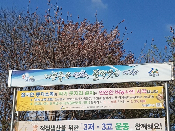 충남 아산시 농업기술센터(소장 남경필)는 21일부터 5월 10일까지 본격적인 못자리 이앙기에 앞서 ‘올바른 온탕소독 및 정확한 못자리 관리’를 통한 키다리병 방제 현장지도를 추진할 예정이다.
