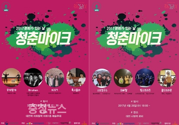 ‘청춘마이크’대전역 공연은 4월 26일 12시30부터 2시간 동안 진행되며 코미디 우카탕카 ,창작뮤지컬 Broken ,인디밴드 R227 ,인디밴드 혹시몰라 4개팀이 청춘마이크를 잡는다.