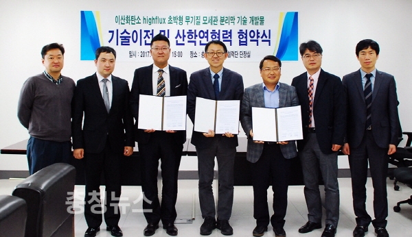 충남대 산학협력단(단장 김영국)과 에너지과학기술대학원 조철희 교수팀은 초박형 제올라이트 모세관 분리막 및 막모듈 제조기술을 제올라이트 분리막 전문회사인 ㈜파인텍에 기술을 이전했다.