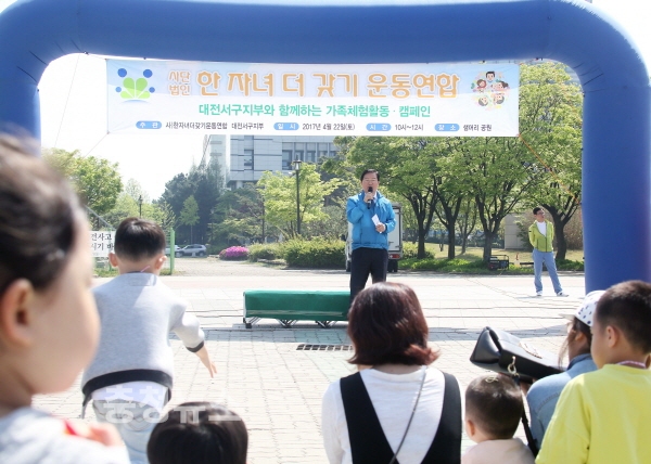 대전 서구(구청장 장종태)는 22일 샘머리 공원에서 (사)한 자녀 더 갖기 운동연합 대전 서구지부 주관으로 ‘건강하고 새로운 가족 문화 만들기’ 행사를 개최했다고 밝혔다.