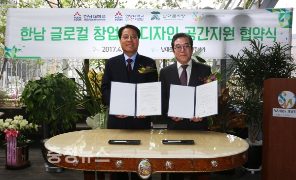 한남대는 지난 21일 서울 남대문시장에서 이덕훈 총장과 최창식 서울중구청장, 김재룡 ㈜남대문시장상인회장, 세계한인무역협회(OKTA) 호치민지회 김태곤 회장 등이 참석한 가운데 ‘한남 글로컬 창업&디자인센터’ 개소식을 가졌다. 또한 시장상인회와 소규모 점포 10개를 한남대 학생들의 창업을 위해 무상으로 임대해주기로 협약을 체결했다. 10개 점포의 연 임대료는 약 1억원 상당이다.