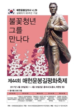 행사 일정을 살펴보면 의거 일인 오는 29일에는 오전 9시 40분부터 온천사거리에서 출발해 도중도 무대에 도착하는 ‘윤 의사 영정 모시기’를 시작으로 ▲사물놀이 등 식전행사 ▲4·29 상해 의거 85주년 기념식 ▲매헌음악제 ▲의거 퍼포먼스 ‘불꽃청년 윤봉길’ ▲동북아 평화음악제 ▲평화토크 콘서트 등이 진행된다.