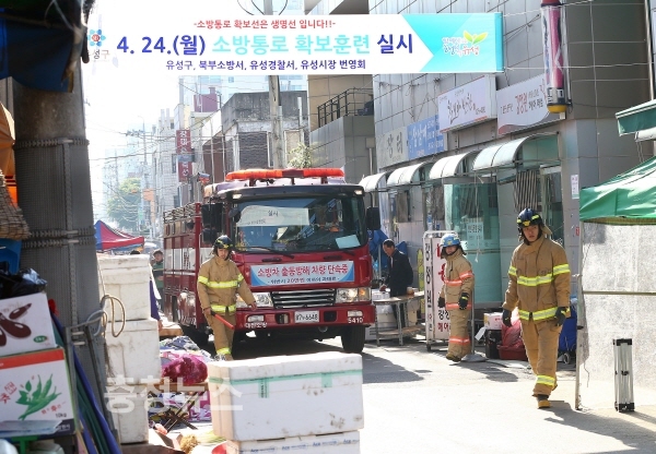 대전 유성구(구청장 허태정)는 24일 재래시장 화재사고를 대비해 북부소방서, 유성경찰서와 합동으로 유성장날 소방통로 확보훈련을 실시했다고 밝혔다.
