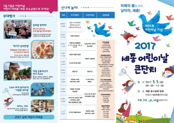 이번 행사는 ‘미래의 꿈을 향해 날아라, 세종!’을 슬로건으로 세종시(시장 이춘희)가 오는 5월 5일 세종호수공원에서 ‘2017 세종어린이날 큰잔치’를 개최한다.