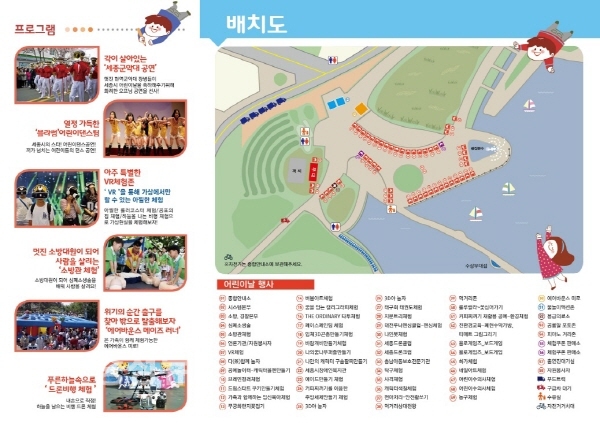 주요 행사프로그램은 ▲식전공연(군악대, 어린이댄스, 합창단) ▲기념식(5월 5일/오전 10시) ▲공연(9팀, 인형극, 버블마술쇼, 버스킹 공연 등) ▲사생대회 ▲체험부스(50개, 직업체험존, 문화예술체험존, 미래과학체험존, 올림픽체험존 등) ▲푸드트럭(20대) ▲부대행사(월리를 찾아라, 먹거리 삼대천왕, 공룡피규어 전시존, 워터존 등)이다.