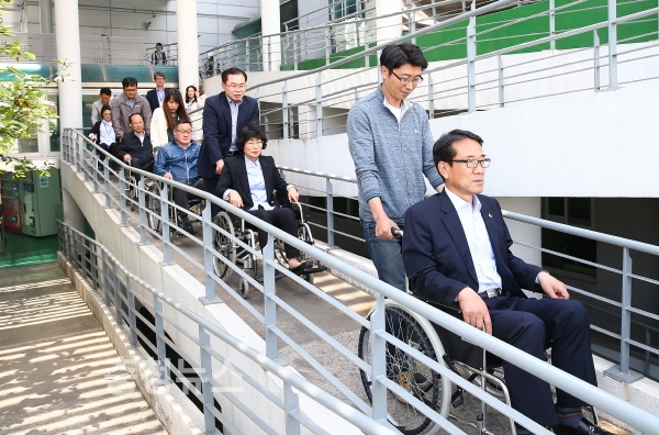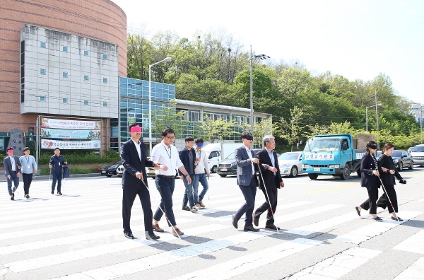 이날 교육은 동영상시청 및 인식개선 이론교육과 함께 휠체어체험, 시각장애 도로체험 등 장애인이 겪는 생활 속 어려움을 체험해 보는 순서로 진행됐다.