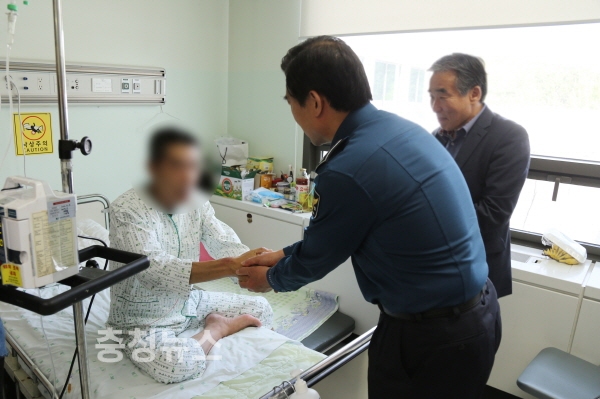 대전중부경찰서는 26일 대전 건양대학교 병원을 찾아 희귀 난치 질환으로 투병중인 경찰관을 위로하고, 동료경찰관들이 모금한 성금을 전달했다.