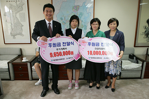 1천965만원의 성금을 전달 사랑의 리퀘스크 성금 전달식이 5월28일 오전10시 대덕구청 구민의 사랑방에서 정용기 구청장, 한국복지재단 대전종합사회복지관장 및 지원대상자 가족2명이 참석 주거환경개선비등 모두1천965만원의 성금을 전달했다. ▲ 사랑의리퀘스크전달식 저작권자 © 충청뉴스 무단전재 및 재배포 금지 한중섭 기자 다른기사 보기 기사가 마음에 드셨나요? 충청뉴스 좋은 기사 후원하기 1,000원 3,000원 5,000원 10,000원 30,000원 50,000원 직접입력 비회원 약관동의하기 ※ 소중한 후원금은 더 좋은 기사를 만드는데 쓰겠습니다.