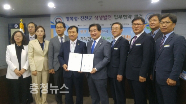 행복청과 진천군(군수 송기섭)은 27일 진천군청 소회의실에서 ‘행복청․진천군 중부권 상생발전을 위한 업무협약’을 체결했다고 밝혔다.