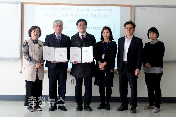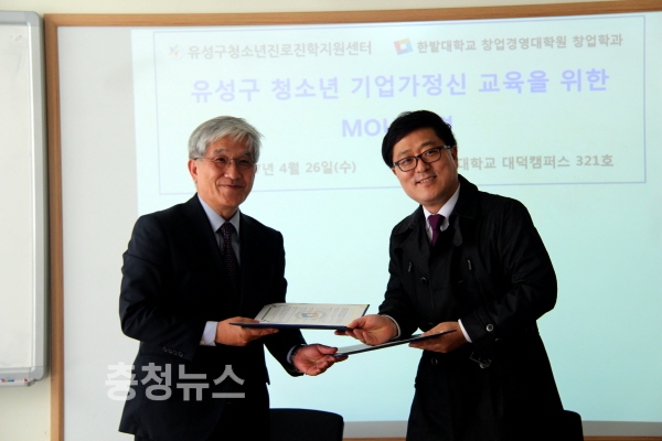 한밭대학교(총장 송하영)는 지난 26일 오후 대덕캠퍼스에서 창업경영대학원 창업학과와 유성구 청소년 진로진학지원센터 간 ‘유성구 청소년 기업가정신 교육을 위한 MOU’를 체결했다고 밝혔다.