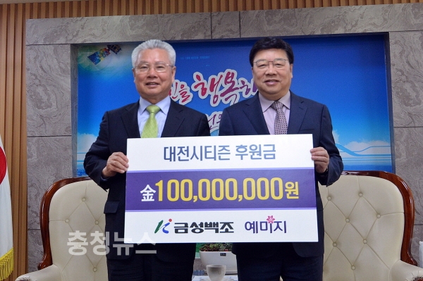 ㈜금성백조주택(회장 정성욱)이 올 시즌에도 대전시티즌의 선전을 기원하는 후원금 1억 원을 전달하였다.