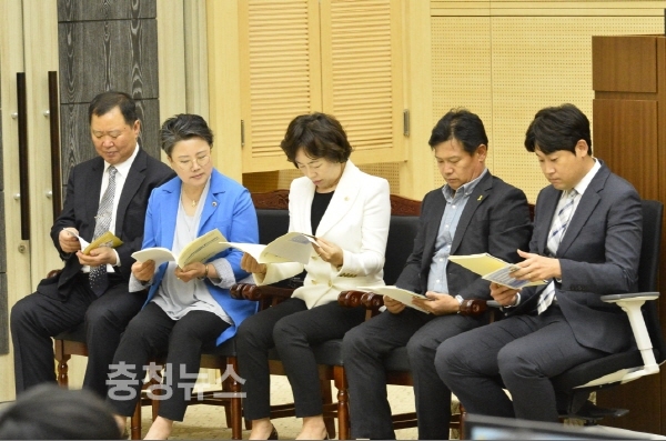좌로부터 고병학 의회과장, 정준이, 김복렬의원 ,김원식 부의장, 고준일 의장