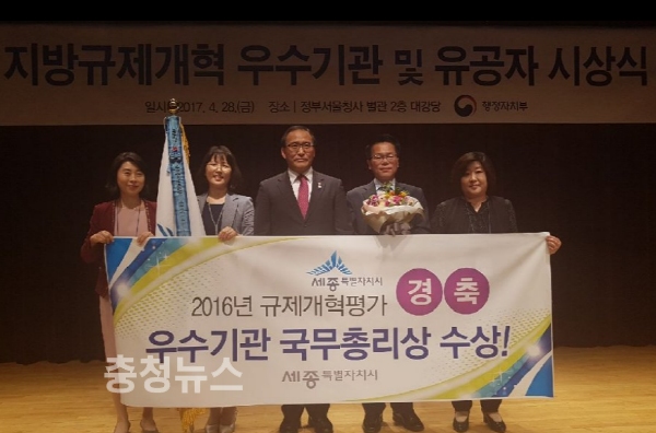 세종시(시장 이춘희)가 행정자치부 주관 ‘2016년 지방규제개혁 평가’에서 우수 지자체로 선정되어 28일 정부서울청사에서 열린 시상식에서 국무총리 기관표창과 특별교부세 1억5,000만원을 받았다.