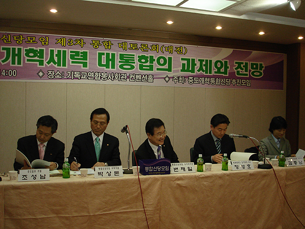 신당 김한길 대표와 민주당 박상천대표는 3일오후 여의도 한 음식점에서 만나 당명과 지도체제, 특정인사 배제론 관련한 쟁점을 타결 하고 4일 오후 3시 국회에서 `중도통합민주당(약칭 통합민주당)' 창당 선언식을 갖기로 합의했다.