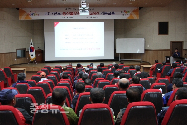 충남 부여군농업기술센터(소장 최석우)는 소비자의 안전먹거리에 대한 관심이 높아지고 있어 고품질 안전농산물 공급을 위한 농산물우수관리인증(GAP) 기본교육을 지난달 28일 농업기술센터 대강당에서 실시했다.