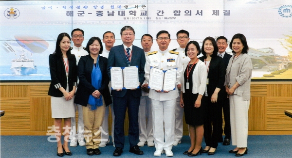 충남대 생활과학대학 김재한 학장과 신승민 해군본부 군수참모부장(준장) 등 양 기관 관계자들은 1일 계룡대 해군본부에서 ‘해군 장병 급식.피복 발전’을 위한 양해각서를 체결했다.