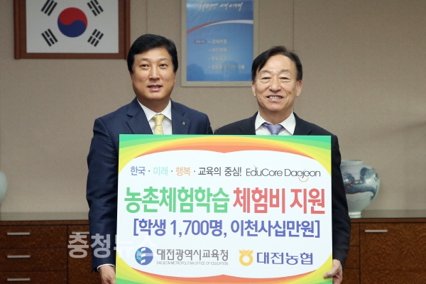 대전교육청(교육감 설동호)은 2일 교육감실에서 농협중앙회 대전지역본부(본부장 안병서)로부터 농촌체험학습비 2천4십만 원을 전달받았다.