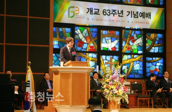 목원대학교(총장 박노권)는 2일 교내 채플에서 박노권 총장과 박영태 이사장, 박병석 국회의원, 장종태 대전서구청장 등 내외귀빈을 비롯한 보직교수, 교직원, 학생 등 8백여명이 참석한 가운데 개교 63주년 기념예배 및 기념식을 가졌다.